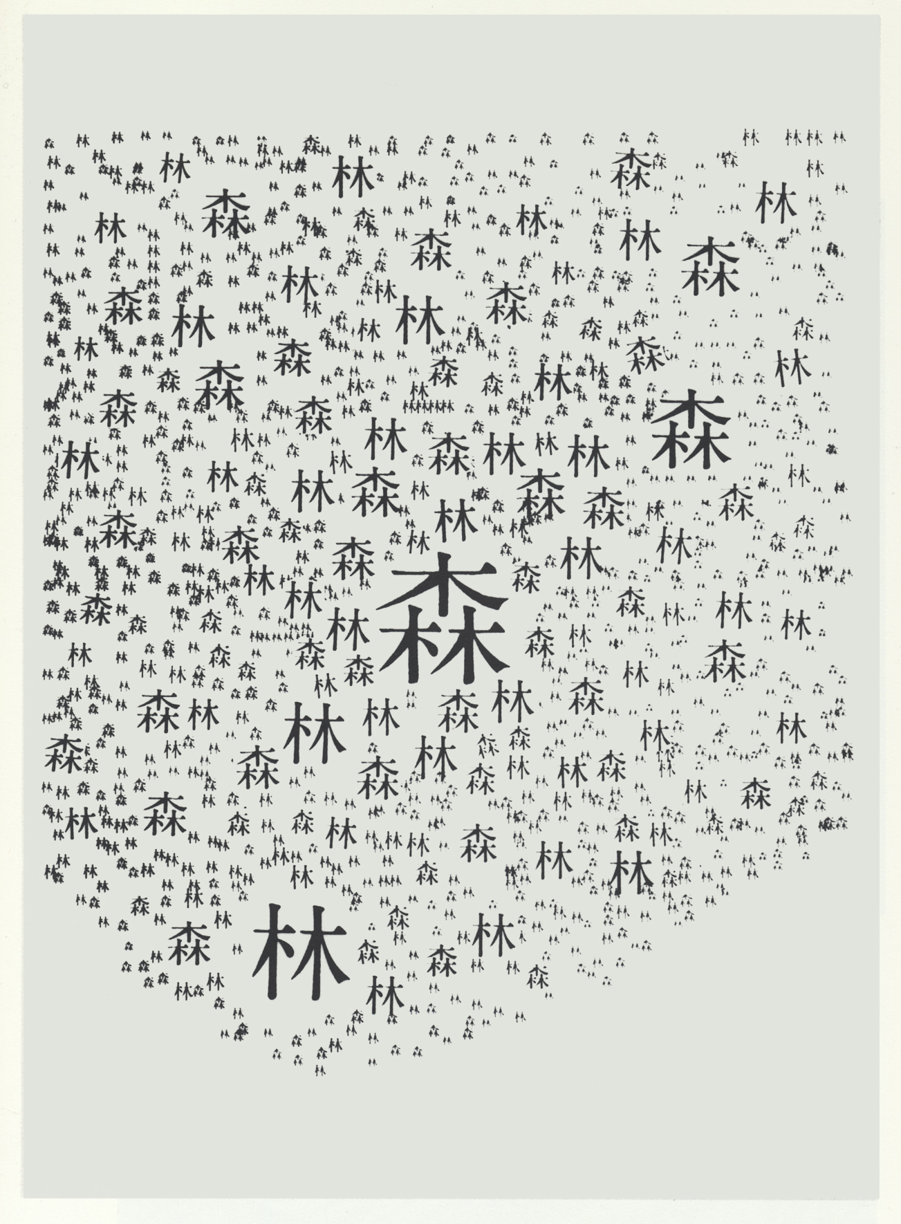 Este cartel de Ryuichi Yamashiro (1920-1997) para la exposición Graphic ‘55 es un clásico del diseño gráfico japonés y una obra maestra de varias artes: la imagen de un bosque hecha con sólo tres caracteres pictográficos: 木, árbol; 林, arboleda; 森, bosque. Es innecesario aclarar que del primero se derivan el segundo y el tercero, multiplicándolo. No lo es advertir que el número de caracteres realmente pictográficos entre los kanji, y sobre todo de los aún reconocibles de inmediato, es muy reducido y el caso de una imagen que a la vez puede verse y leerse, como esta, es bastante excepcional. El original, en seda, 1052 x 740 mm, está en el MOMA de Nueva York.